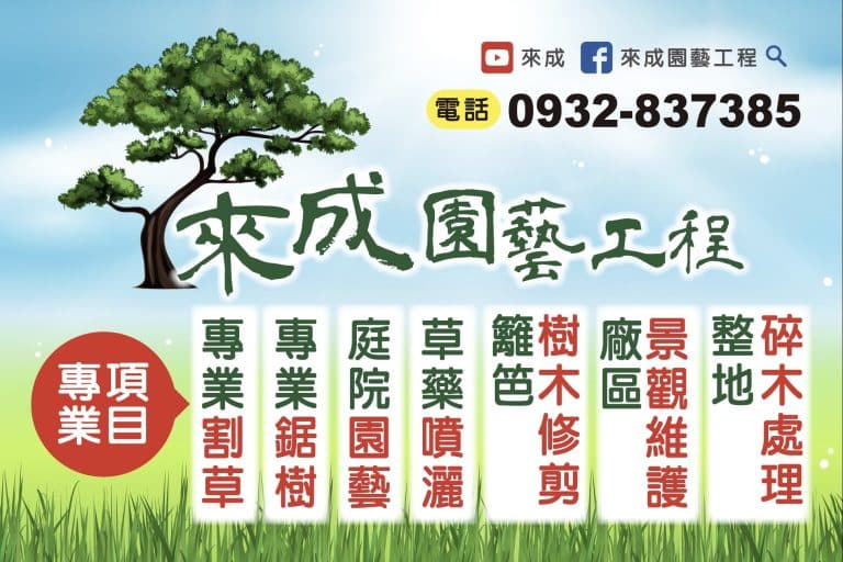 服務特色 台南區園藝維護專業證照、員工保險、政府核發合格廠商、勞工安全訓練 我們了解您對於保持美麗環境的需求,我們的專業團隊將竭誠為您提供高品質的維護服務。 來成園藝工程五大特色: 免費預約估價:我們為您提供免費估價的服務,讓我們的專業園藝師親自前來,評估您的園藝需求,並根據您的喜好和預算提供最合適的維護方案。 專業服務團隊:我們擁有經驗豐富且專業的園藝師和技術人員,為您的園藝空間提供專業的維護服務。無論是樹木修剪、花草管理還是害蟲防治,我們都有相關專業知識證照和技能經驗。 客製化維護:我們將根據您的需求和園藝空間的特點,設計出屬於您的維護計劃。無論您是想擁有一個小型花園還是大型公共空間,我們都會提供最適合的維護方案。 可持續生態:我們重視環境保護,選擇使用可持續的綠色方法來進行維護。我們注重水資源的節省、有機肥料的使用以及生物防治的推廣,以確保您的環境不僅美麗,還具有生態平衡。 一站式服務:我們提供一站式的園藝維護服務,包括草坪管理、樹木修剪、花圃維護、害蟲防治等。您無需為不同的維護項目找不同的供應商,我們將全面照顧您的園藝需求。 服務項目 園藝專業證照/勞工安全證照/高空作業證照 專業除收草具有丙級園藝技術士施作/絕不使用除草劑/請點擊閱讀詳細資料 專業喬木修剪具有丙級園藝技術士施作/請點擊閱讀詳細資料 病蟲害防治具有防治合格證照施作/請點擊閱讀詳細資料 專業灌木修剪具有丙級園藝技術士施作/請點擊閱讀詳細資料 園藝專業證照/勞工安全證照/高空作業證照 景觀園藝綠化具有丙級園藝技術士施作/請點擊閱讀詳細資料 整地工程具有丙級園藝技術士施作/請點擊閱讀詳細資料 廢棄物處理/枝條處理具有一機三證合格證照施作/請點擊閱讀詳細資料 登革熱防治噴藥具有丙級園藝技術士施作/請點擊閱讀詳細資料 服務地區~大台南全區 服務地區:台南市、永康、安南、東區、北區、南區、中西區、新營、仁德、歸仁、安平、佳里、善化、麻豆、新化、新市、關廟、安定、白河、學甲、鹽水、西港、下營、後壁、七股、六甲、官田、柳營、東山、將軍、玉井、北門、大內、楠西、南化、山上、左鎮、龍崎 專人現場場勘 立即預約免費估價 好處 1 年度園藝維護更優惠 好處 2 正統公司一律開立統一發票 好處3 施作人員皆有專業證照、職業安全衛生教育訓練、員工團保 好處 4 一站式服務,全面照顧您的園藝需求 工具清單 這些工具在園藝維護中起到重要作用,幫助您創建出美麗、健康的園藝空間。定期保養至關重要,如果您想深入了解特定工具的使用方法,歡迎隨時與我們聯繫!